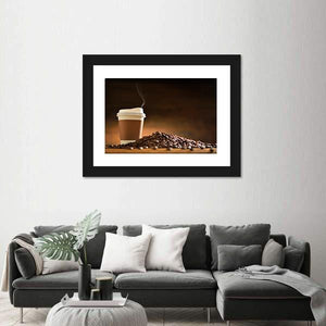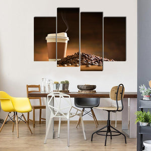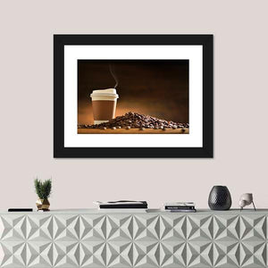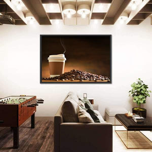 This canvas art features a realistic depiction of a coffee cup surrounded by roasted coffee beans and wisps of steam. Its warm and inviting colors create an aromatic atmosphere, perfect for adding a cozy touch to your kitchen or dining area.