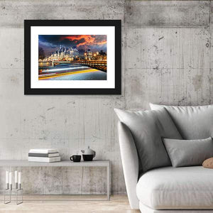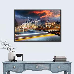Paris City Hall at night presents a vibrant, nocturnal cityscape with illuminated buildings, a river and a bridge. The scene uses blue, orange, white and black tones and features streaking vehicle light trails and dramatic clouds. It works well in modern rooms and travel-themed walls.