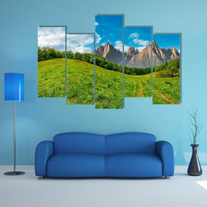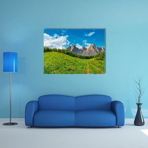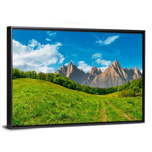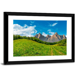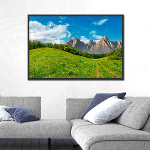 This photorealistic landscape shows a dirt path cutting through green hills toward a distant mountain range beneath blue sky and soft clouds, with faint contrails. The composition uses depth and the rule of thirds to create a calm, majestic feeling. It suits modern living spaces and other nature-focused room decor.