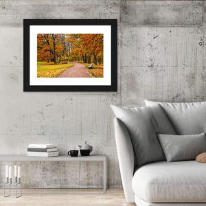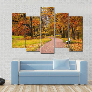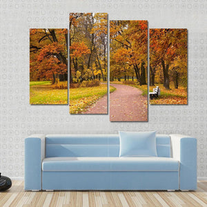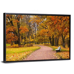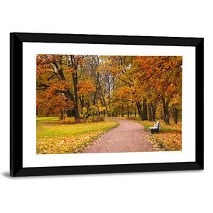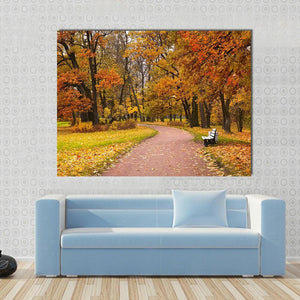 This canvas art captures a serene landscape of a winding park path lined with autumn trees. Rich hues of orange, yellow, and brown evoke a peaceful autumnal atmosphere, making it a lovely addition to any space.