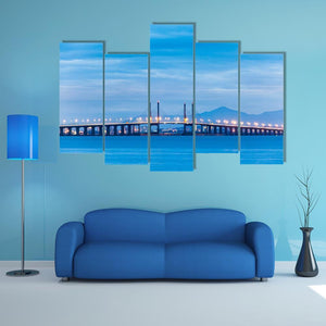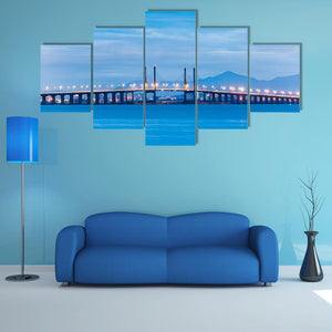 A realistic landscape canvas showing a bridge over water at twilight, with illuminated bridge lights, a cloudy sky, and distant mountains. Soft blues, greys and a touch of orange reflect on the water, creating a calm, serene mood. Fits well in modern or coastal-inspired rooms as a quiet focal piece.