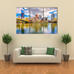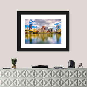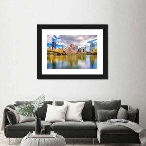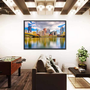 Pittsburgh Skyline Canvas Wall Art shows the city skyline with a yellow suspension bridge and buildings reflecting in the river. The daytime scene uses a modern, colorful palette of blue, yellow, green, brown, and white for a vibrant, reflective urban mood. It works well as contemporary room decor in modern living rooms or offices.