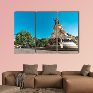 This realistic canvas shows the monument at Place de la Republique in Paris, seen from a low, wide-angle perspective with the figure of Marianne and the bronze lion statues at its base, framed by nearby buildings and trees. Rendered in blues, whites, greens and warm bronze, the scene feels grand and civic — a historical cityscape that pairs well with modern home decor.