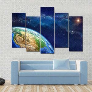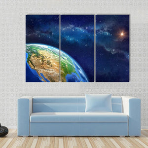 This canvas features a stunning, photorealistic view of Earth from space, highlighting North America amid a cosmic backdrop of stars and nebulae. The serene color palette of blues and greens evokes a sense of vastness and wonder.