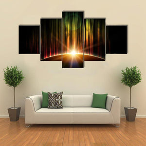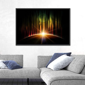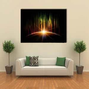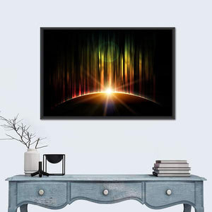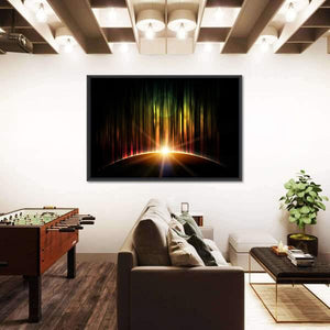 This abstract canvas features a stunning horizon illuminated by vibrant light beams. The dynamic colors of black, gold, and green create an energetic atmosphere, making it a striking addition to modern décor.