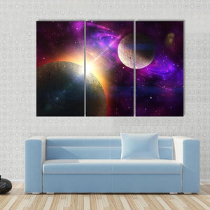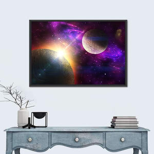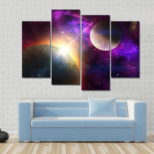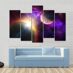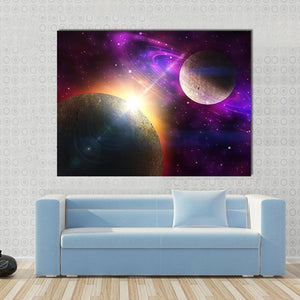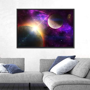 Dive into the depths of space with this vibrant canvas art featuring a swirling purple nebula and a glowing sunburst. Its cosmic and awe-inspiring atmosphere makes it a striking addition to modern decor.