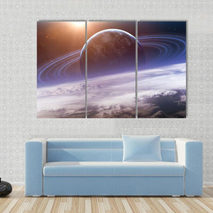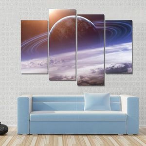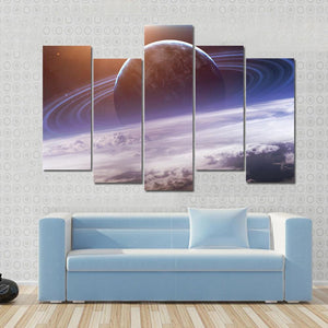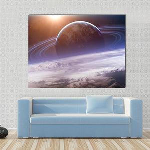 This canvas art captures a stunning view of a gaseous planet adorned with concentric rings. The cosmic scene features a rich palette of purple, blue, and orange, evoking serene and awe-inspiring feelings.