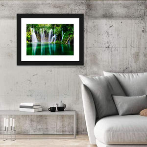This canvas wall art captures the serene beauty of Plitvice Lake National Park in Croatia, showcasing a mesmerizing waterfall surrounded by lush greenery and clear emerald water. The refreshing tones of green, blue, and white create a natural atmosphere, perfect for enhancing any space.