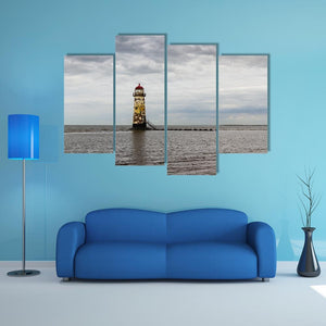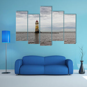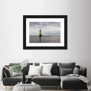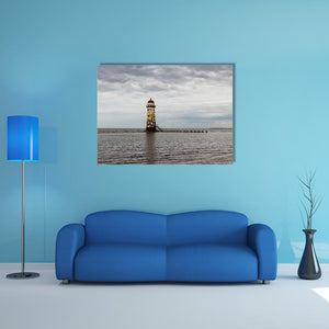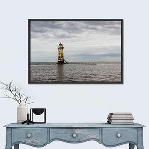 This photographic canvas art captures the serene beauty of a striped lighthouse standing by the ocean. The calm palette of grey and blue, accented with touches of yellow and red, evokes a sense of isolation, making it a perfect addition to tranquil spaces.