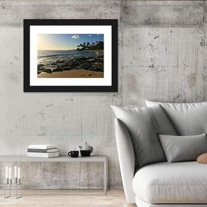 Poipu Beach Park on Kauai appears as a realistic beach landscape with palm trees, rocks, ocean and footprints in the sand. Sunlight reflecting on the water gives the scene a tranquil, sunny mood. The print works well in coastal or modern interiors as a calm, nature-focused accent.