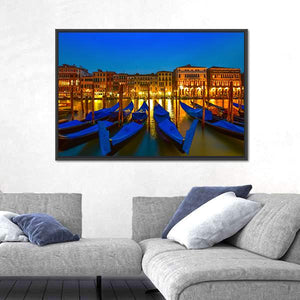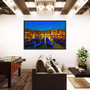 A cityscape postcard of Venice showing gondolas on the Grand Canal. Warm blues and golds at night create a tranquil, romantic, and vibrant mood, with depth and perspective leading past docked gondolas and illuminated buildings. Pairs well with modern or travel-inspired rooms.