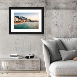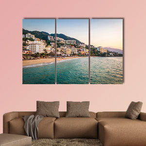 Puerto Vallarta In Jalisco Mexico Canvas Wall Art depicts a sunlit coastal scene with beach, calm ocean, hillside buildings and tropical vegetation. The realistic blue‑green palette creates a serene, sunny mood that fits modern or coastal room decor.