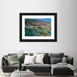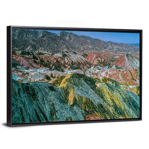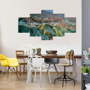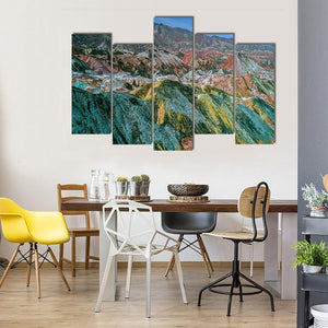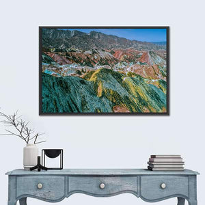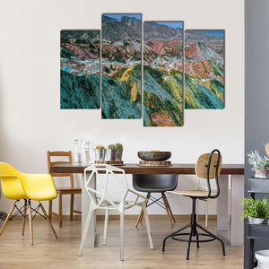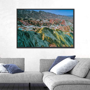 This canvas art showcases a vibrant landscape of colorful mountains and striking rock formations. Its expansive composition and contrasting colors evoke a natural and majestic atmosphere, making it a captivating addition to any room decor.