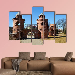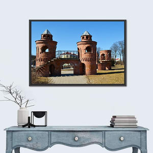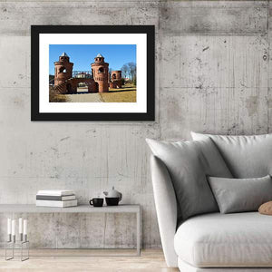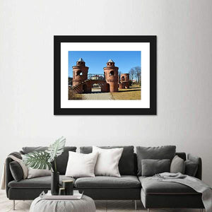 A photorealistic view of a red children's castle in Pinsk, Belarus, featuring symmetrical brick towers and a stone bridge. Set beneath a clear blue sky with warm red, brown and green tones, the scene feels bright, sunny and inviting. It suits children's rooms or playful, architecture-focused spaces that need a cheerful focal point.