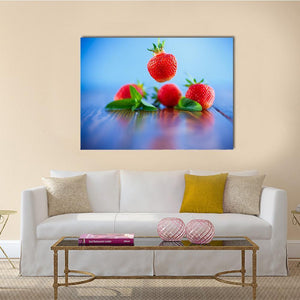 This photorealistic canvas print of ripe strawberries and mint leaves feels refreshing and vibrant. A shallow depth of field draws attention to a glossy wooden surface while one strawberry appears to float, suggesting a hint of motion. Works well in modern home spaces like kitchens and dining areas.