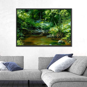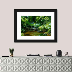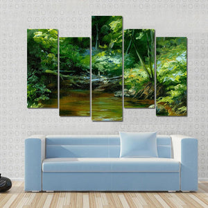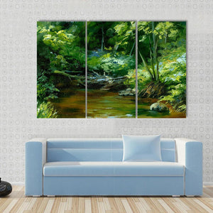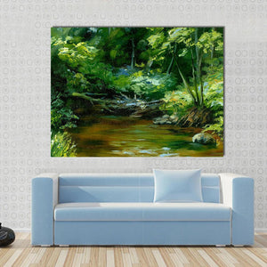 This impressionistic canvas features a peaceful scene of a river flowing through a thick forest. The serene palette of greens, browns, and blues captures the tranquility of nature, making it an ideal addition to any space seeking a touch of calm.