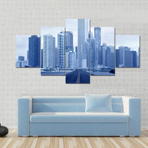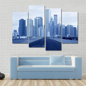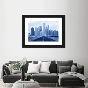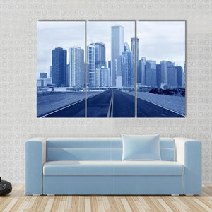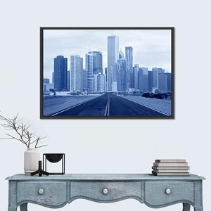 Capture the essence of urban life with this modern canvas art featuring a serene skyline and an inviting road. The monochromatic blue tint and industrial vibes bring a vastness to any space.