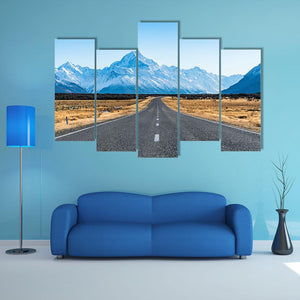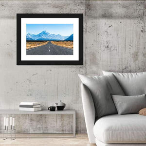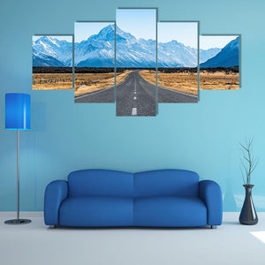 This landscape features a captivating road leading towards a majestic mountain range. The serene vibe, with its snow-capped peaks and dry grass fields, invites a sense of adventure and exploration.
