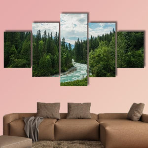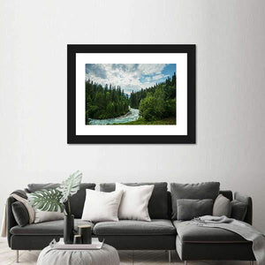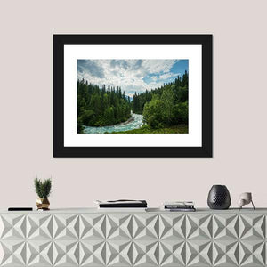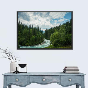 Robson River in British Columbia winds through a dense evergreen forest toward distant mountains beneath a partly cloudy summer sky. Rendered in a realistic style with a clear sense of depth and a rule-of-thirds composition, the scene feels serene, majestic, and gently wild. This landscape canvas works well in homes and modern, nature-inspired rooms.