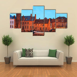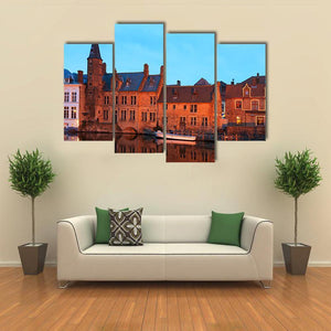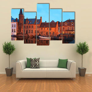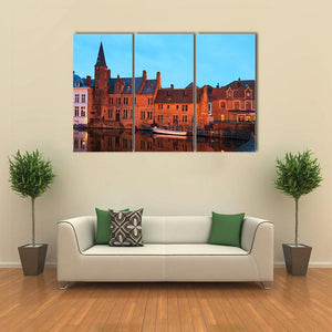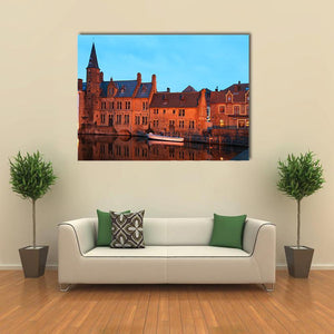 This canvas art piece captures a serene canal scene in Brugge, showcasing beautiful buildings reflected in the water under a twilight sky. Its realistic style and calming palette of orange, blue, and brown make it a timeless addition to any space.