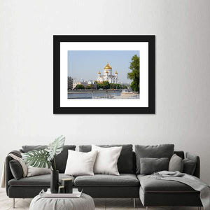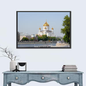 Mosque In Moscow Canvas Wall Art shows a realistic cityscape of a riverside cathedral with golden domes, a white facade, trees, and a riverfront promenade. Its peaceful mood and soft blue, green, and gold palette suit modern interiors and provide a calm focal point for room decor.