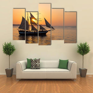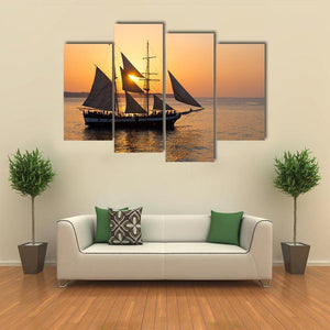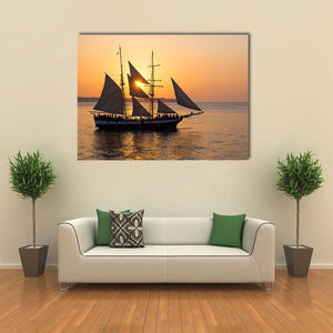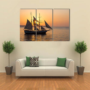 This striking canvas depicts a tall ship sailing at sunset, its reflection dancing on the ocean. With warm orange and blue hues, it brings a serene and majestic vibe to any space.