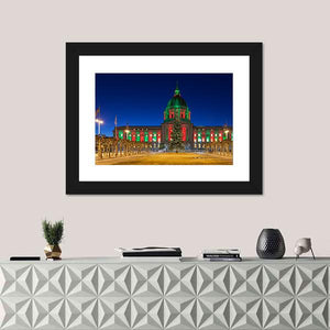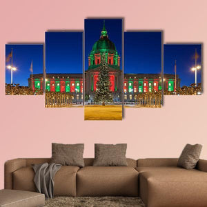 San Francisco City Hall is centered in this realistic canvas print, its dome-shaped roof and columns of lights glowing on a winter night. A tall Christmas tree and green, red, blue and yellow accents give the scene a festive, celebratory, grand mood. The cityscape works well as room decor for living rooms or entryways.