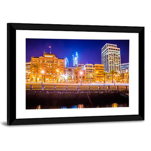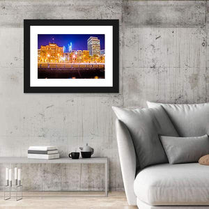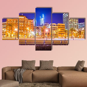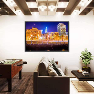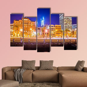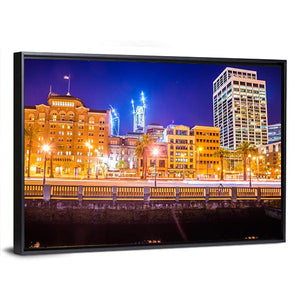 San Francisco Night Skyline Canvas shows downtown San Francisco’s skyline and waterfront at night, with illuminated windows, construction cranes and palm trees in a photorealistic cityscape. Deep blues and warm yellows create a vibrant, urban nighttime mood. The wide city scene fits modern living rooms or entryways that want a touch of city character.