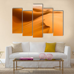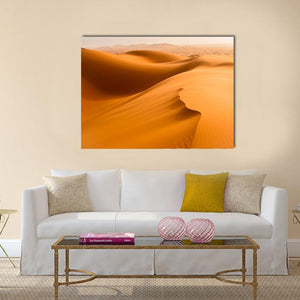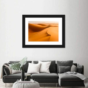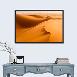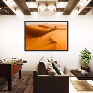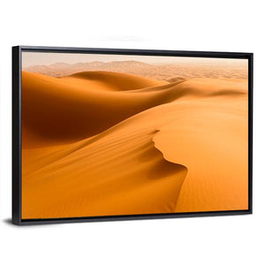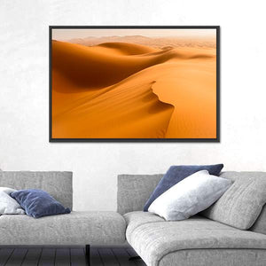 This serene canvas art captures the warm tones of desert dunes and sand waves in Merzouga, Morocco. The minimalist composition features rolling dunes and tire tracks, inviting a tranquil vibe to any space.