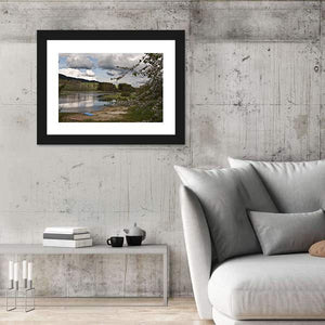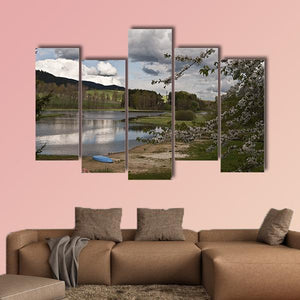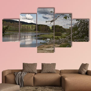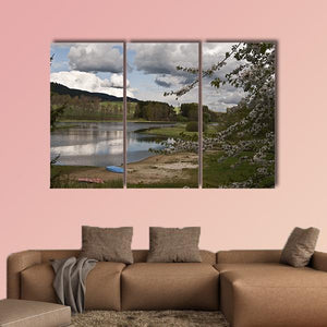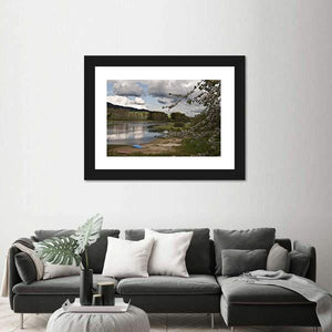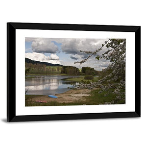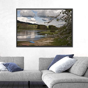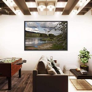 A realistic landscape of a sandy beach beside the River Vltava, featuring a small blue boat, a flowering tree with white blossoms, distant mountains and calm water. Soft blues, greens and neutral tones give the scene a peaceful, serene, natural mood. The print fits well in home living spaces and nature-inspired rooms.