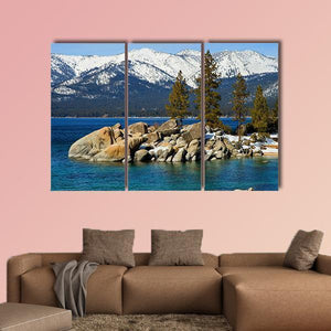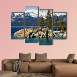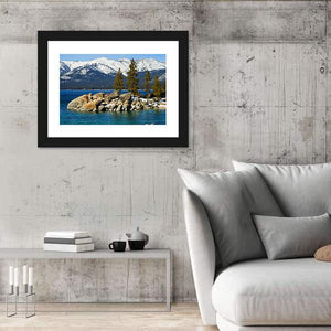 A realistic winter view of Lake Tahoe featuring clear blue water, snow-capped mountains, textured boulders and pine trees. The scene’s serene, majestic, crisp mood and cool blue-and-white palette suit modern living spaces and room decor that favor nature-focused art.
