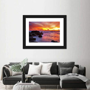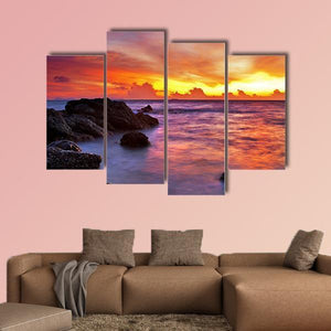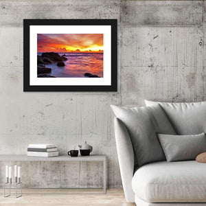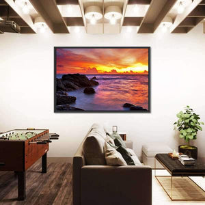 A photorealistic view of a tropical beach at sunset, showing the ocean, dark rocks, and a fiery sky in orange, yellow, purple, and blue. The rule-of-thirds composition and calm water create a serene yet dramatic, vibrant mood. Suited to modern house interiors and contemporary room decor.