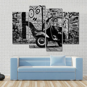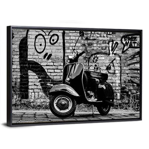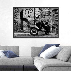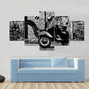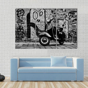 This captivating canvas features a scooter set against a gritty urban backdrop. With its edgy, vintage vibe and striking black, white, and gray palette, it's a great addition to any modern decor space.
