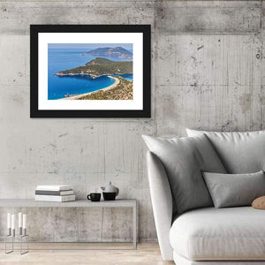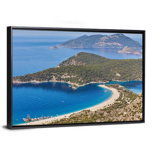 This photorealistic canvas captures an aerial, wide view of a curving white-sand beach, clear blue water, distant islands and boats. The tranquil, scenic image—rendered in blues, greens, white and tan—adds a calm coastal feel that suits modern home and room decor.