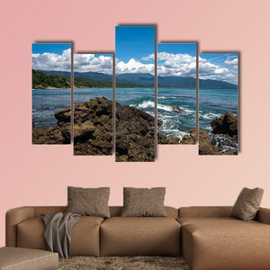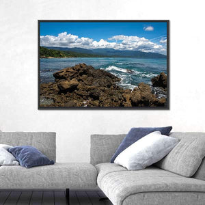 Seascape In Chuspa Beach depicts the ocean meeting a rocky coastline under cloud-streaked skies, with waves crashing on rocks and lush green vegetation on the distant mountains. The realistic composition uses depth and the rule of thirds to create a serene, expansive mood that suits modern homes and coastal-inspired rooms.