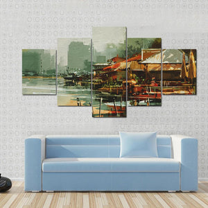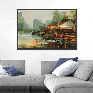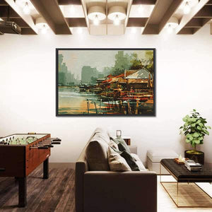 This watercolor-style canvas art showcases a serene view of riverfront buildings and boats against a calm water backdrop. The impressionistic style features brown, green, and grey tones, creating an atmospheric vibe that enhances any room decor.