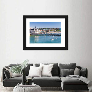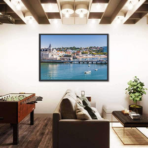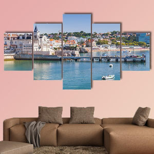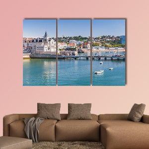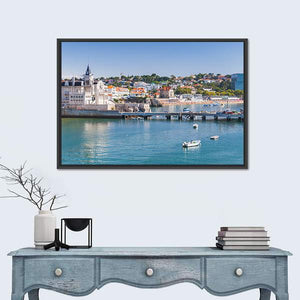 A photographic canvas of the seaside cityscape of Cascais, showing boats in the harbor, buildings on a sunlit hill, and a clear blue sky. Calm blues, whites, greens and warm browns create a peaceful, daytime mood that fits coastal or modern interiors.