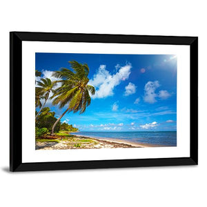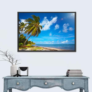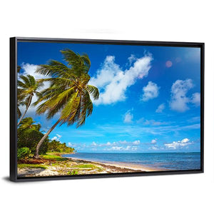 Bring a serene tropical escape to your home with this photorealistic canvas featuring a lush beach scene. With palm fronds swaying gently in the breeze and the sun glistening on the ocean, this artwork evokes a tranquil vacation vibe.