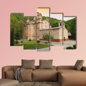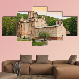 This canvas shows the Serbian Orthodox Monastery Ravanica — a stone building with domes set among lush greenery and a cobblestone path beneath a warm sunset sky. Rendered realistically in brown, green, orange, and white tones, it creates a peaceful, historic atmosphere and suits living rooms, hallways, or home studies.