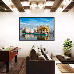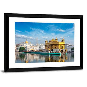 This beautiful canvas art features the majestic Golden Temple, capturing its golden domes reflecting in the tranquil water below. The serene atmosphere is enhanced by a vibrant blue sky and lush white buildings in the backdrop, making it a stunning piece for any space.
