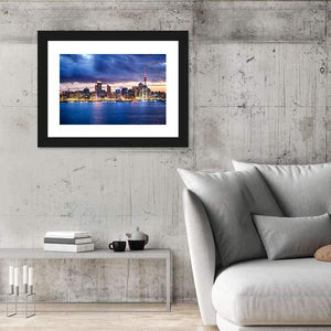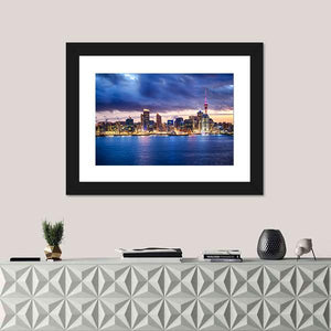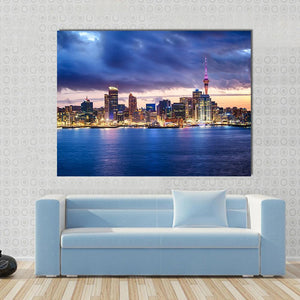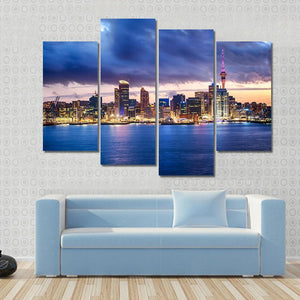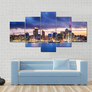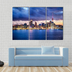 This canvas features the vibrant skyline of Auckland, showcasing illuminated buildings against a dramatic twilight sky. It's a modern piece that adds a lively touch to any space.
