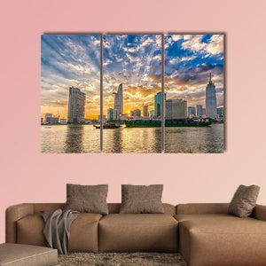 River In Ho Chi Minh City shows a modern cityscape with skyline, river traffic, boats and cloud-streaked light as sun rays break through. The sunset palette of blue, orange, white, green and brown gives the scene a dramatic yet serene, vibrant feel. It works well in modern homes, especially living rooms or offices seeking a city-by-the-water accent.