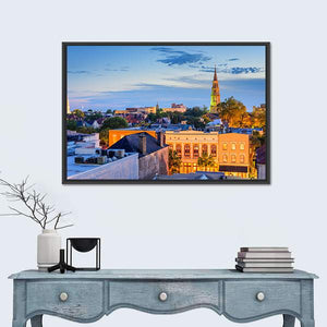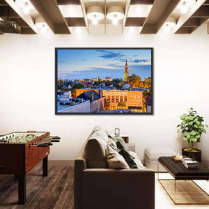 A calm, twilight view of a South Carolina town skyline, showing buildings, a church steeple, and soft clouds. Soft blues and warm yellows from lit windows create a serene, realistic scene that suits modern living rooms and offices.