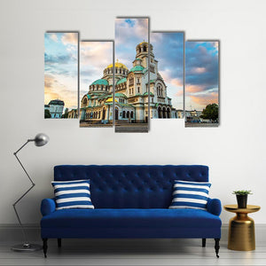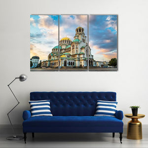 This canvas features the grand St Alexander Nevsky Cathedral, showcasing intricate architecture against a serene sky filled with cumulus clouds. The photorealistic detail captures the stunning golden domes and green roofs, making it a striking addition to your wall art collection.