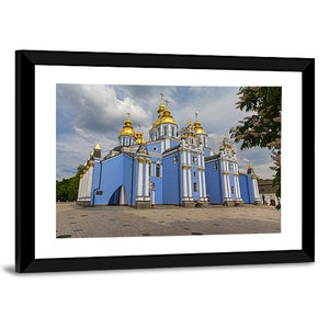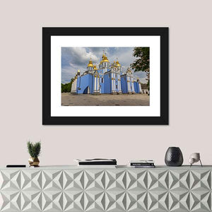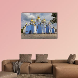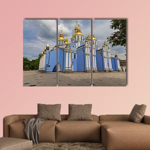 St Michaels Golden Domed Monastery in Ukraine is a realistic canvas print showing the church’s blue facade with gleaming golden domes and crosses. The wide triptych composition and cloudy sky give the scene a grand, serene, majestic mood—suitable for a living room, entryway, or quiet study and religious spaces.