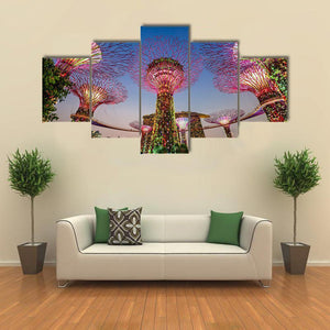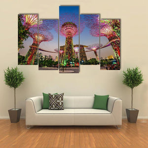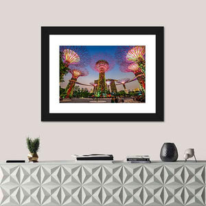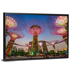 This canvas wall art features the enchanting supertrees at Gardens by the Bay, bathed in vibrant colors like green, pink, and yellow. The captivating scene, illuminated under a nighttime sky, evokes a magical ambiance, ideal for modern décor.
