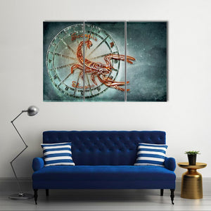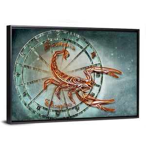 A stylized scorpion sits at the center of a zodiac wheel, rendered in bronze, teal and blue for a mystical, astrological feel. The graphic, central composition works well as a bold art piece in modern or astrology-themed rooms.