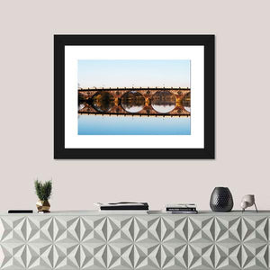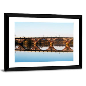 This realistic landscape print shows the arched Tay Bridge spanning a calm river, with tree foliage reflected in the water beneath a clear sky. Its blue, brown, gold and white palette and peaceful mood work well in living rooms, studies, or entryways with modern or traditional decor.