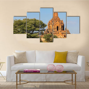 This landscape canvas shows the Tayok Pye temple framed by lush green trees and golden grass, conveying a serene, historic warmth in orange, blue, green, and yellow tones. Its rule-of-thirds composition suits a calm living room, hallway, or meditation corner.