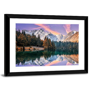 The Fusine Lake, Italy canvas captures snow-capped mountains, pine trees, a wide sky and a clear lake reflecting dramatic clouds at sunset. Rendered in purple, orange, green, white and blue, the scene feels serene, vibrant and majestic and suits modern or nature-inspired room decor.